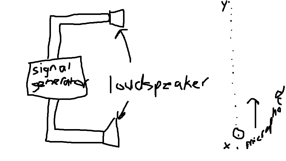 The diagram shows two loudspeakers connected to the same signal generator. As a microphone is moved along the path XY a series of maximum and minimum sound levels is detected.