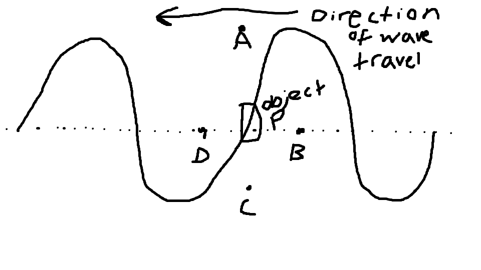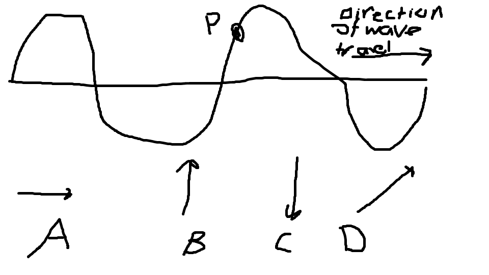 The diagram below shows ripples on the surface of water at one instant of time. The ripples are moving right to left and a small object, P, is floating in the water. After a quarter of a time period, which letter