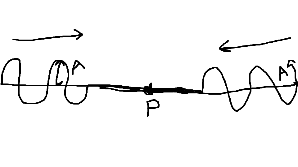 Two waves of equal frequency, wavelength and amplitude, A, are travelling along a string towards the same point P as shown below.