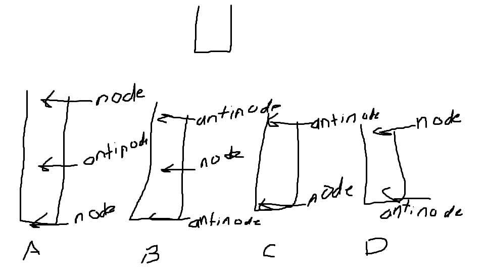 Which one of the following diagrams correctly shows the positions of the displacement nodes and antinodes when the fundamental standing wave is formed in the tube?