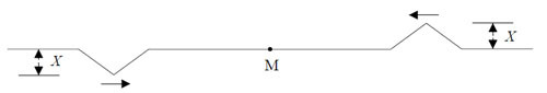 Two identical triangular pulses of amplitude X travel toward each other along a string. At the instant shown on the diagram below, point M is midway between the two pulses.