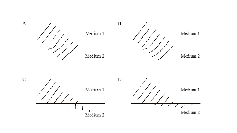 A plane wave approaches and passes through the boundary between two media. The speed of the wave in medium 1 is greater than that in medium 2. Which one of the following diagrams correctly shows the wavefronts?