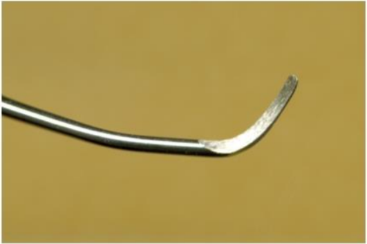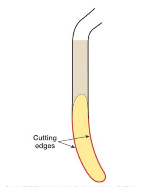 The cutting edges are curved. In comparison to a universal curet that has parallel cutting edges