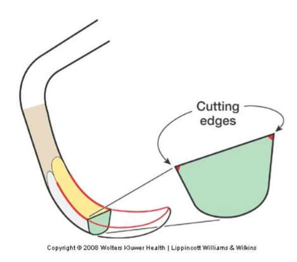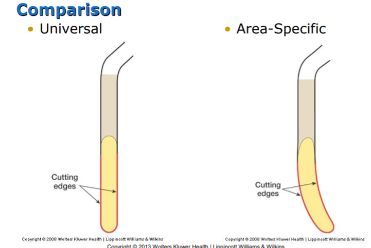Only the lower cutting edge is used for calculus removal → called the working cutting edge. The other edge is called the nonworking cutting edge, which helps protect the soft tissue.