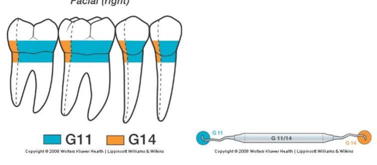 A area specific curet periodontal instrument used to remove light calculus deposits from the crowns and roots of teeth