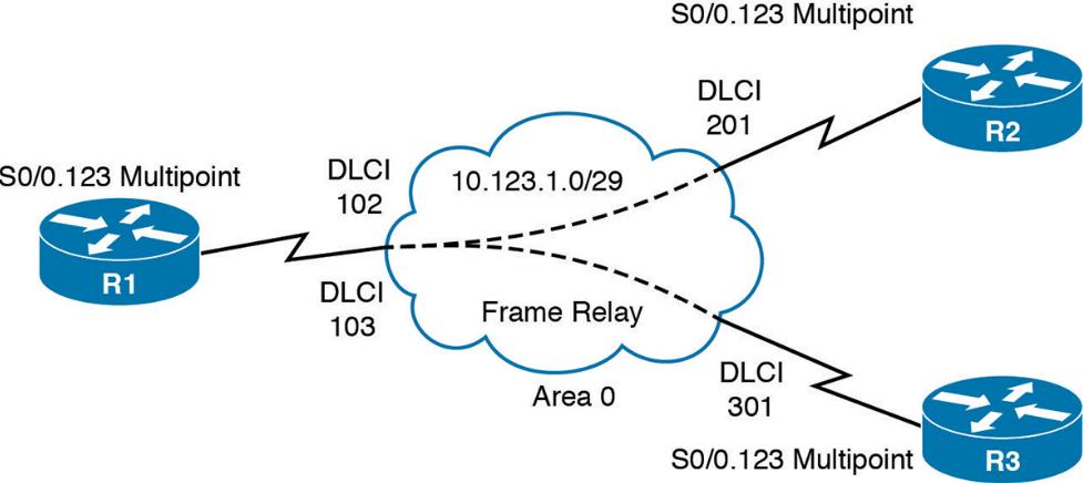 Frame Relay interfaces set the OSPF network type to nonbroadcast by default. The hello protocol interval takes 30 seconds for this OSPF network type. Multiple routers can exist on a segment, so the DR functionality is used. Neighbors are statically defined with the neighbor command because multicast and broadcast functionality do not exist on this type of circuit. Configuring a static neighbor causes OSPF hellos to be sent using unicast.