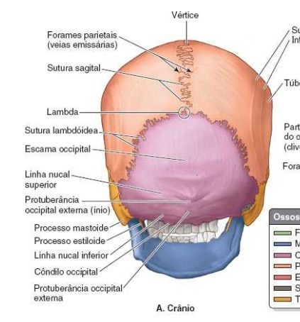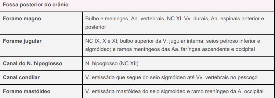 Fossa posterior do crânio: .Forame magno .Forame jugular .Canal do hipoglosso .Canal condilar .Forame mastóideo