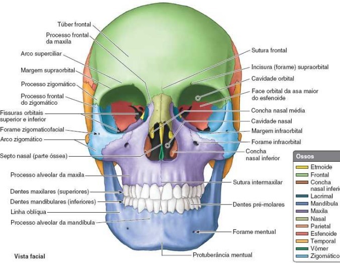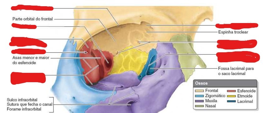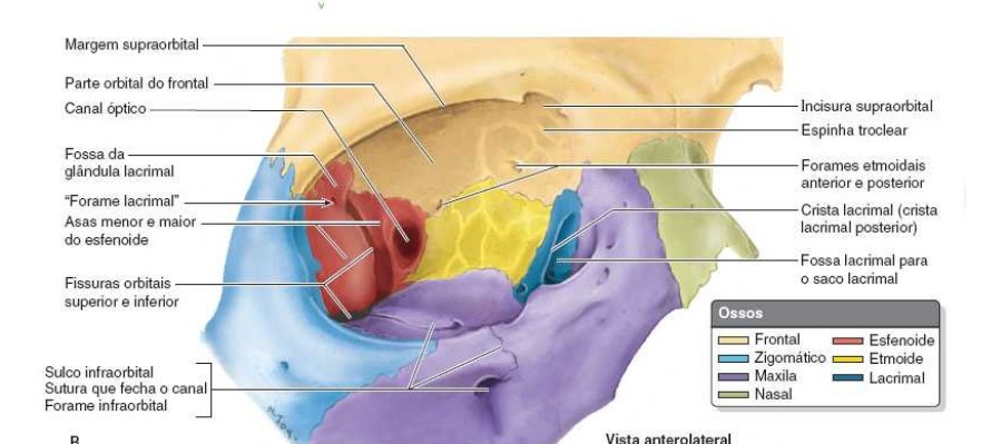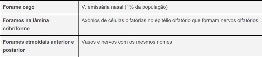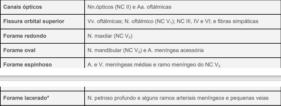 Fossa média do crânio: .Canais ópticos .Fissura orbital superior .Forame redondo .Forame oval .Forame espinhoso .Forame lacerado
