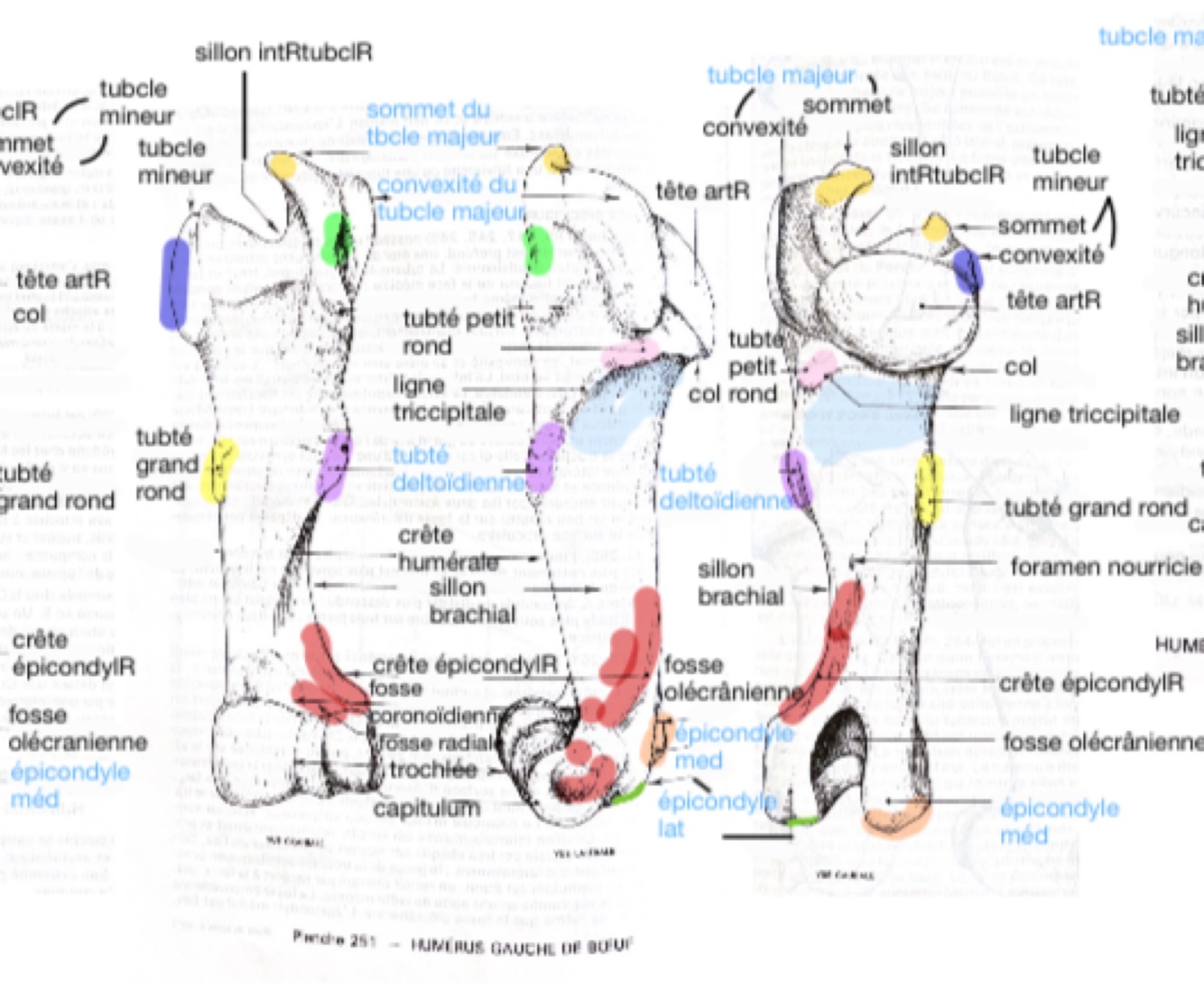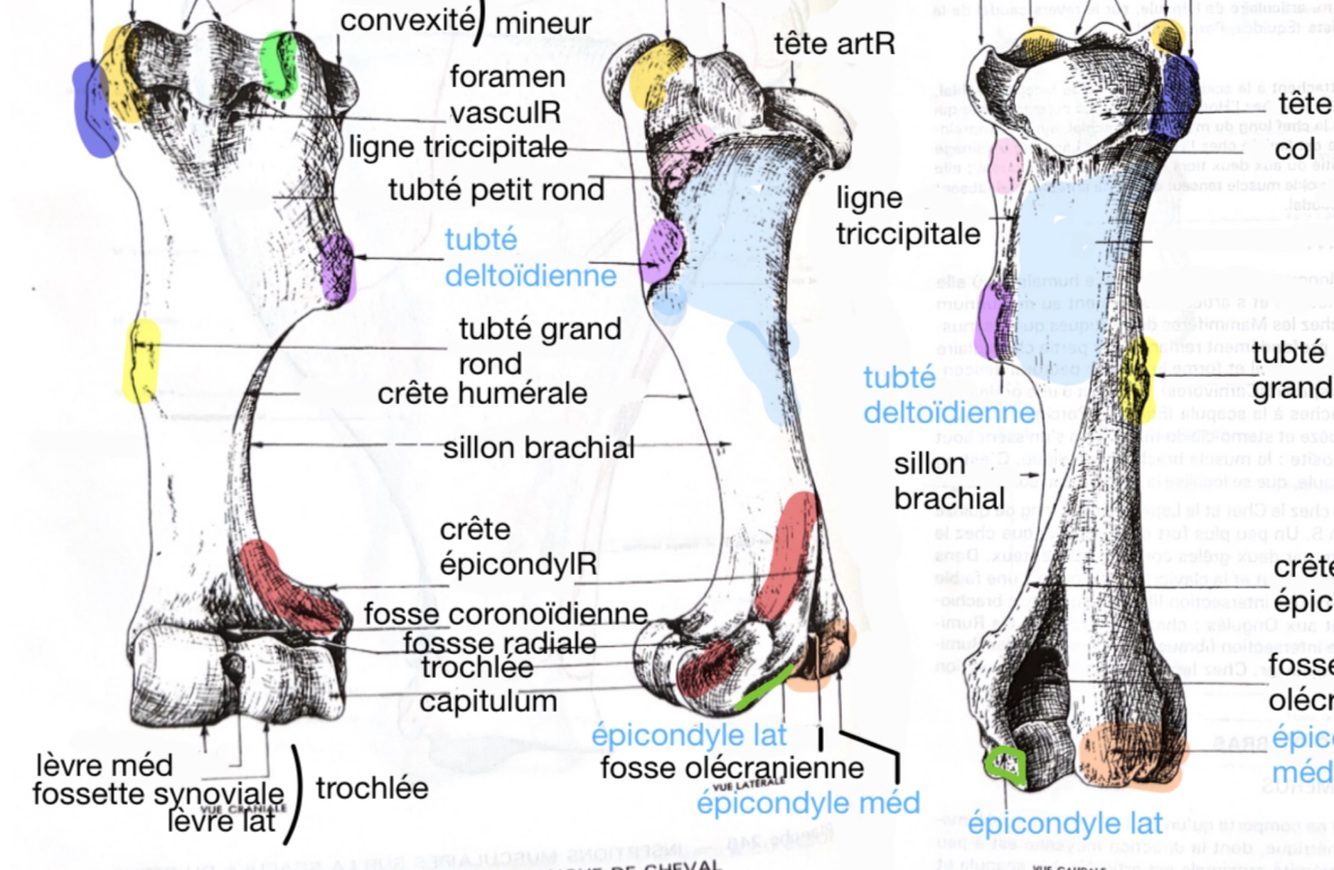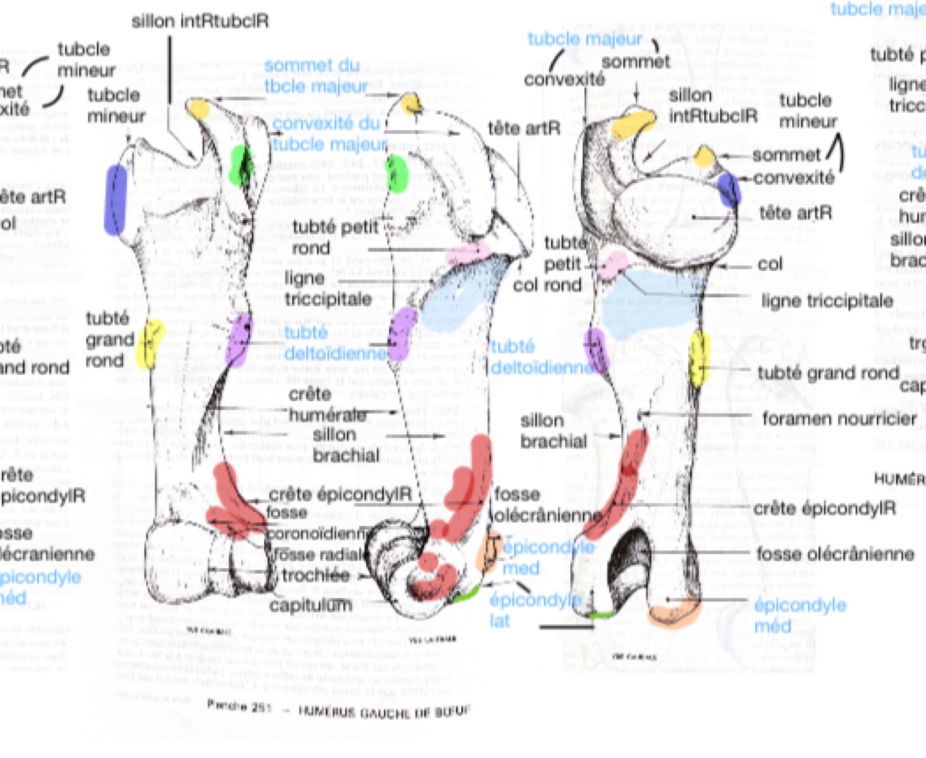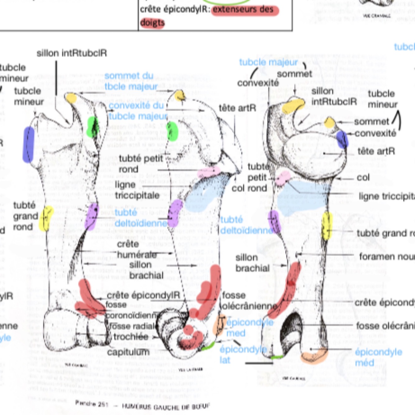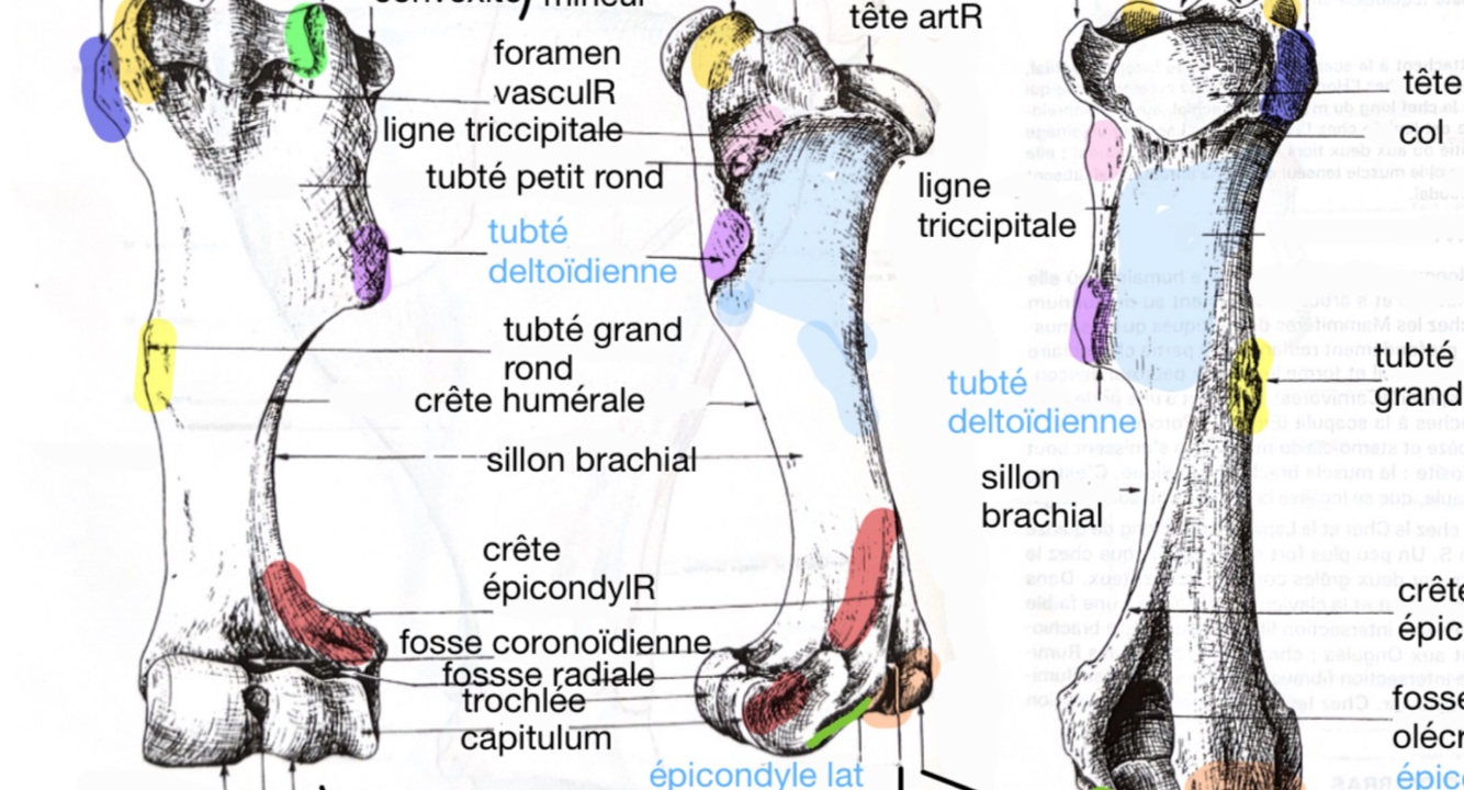 Chez cv, la Crète humérale, tubérosité deltoïdienne et grand rond, Crète epicondylaire sont: