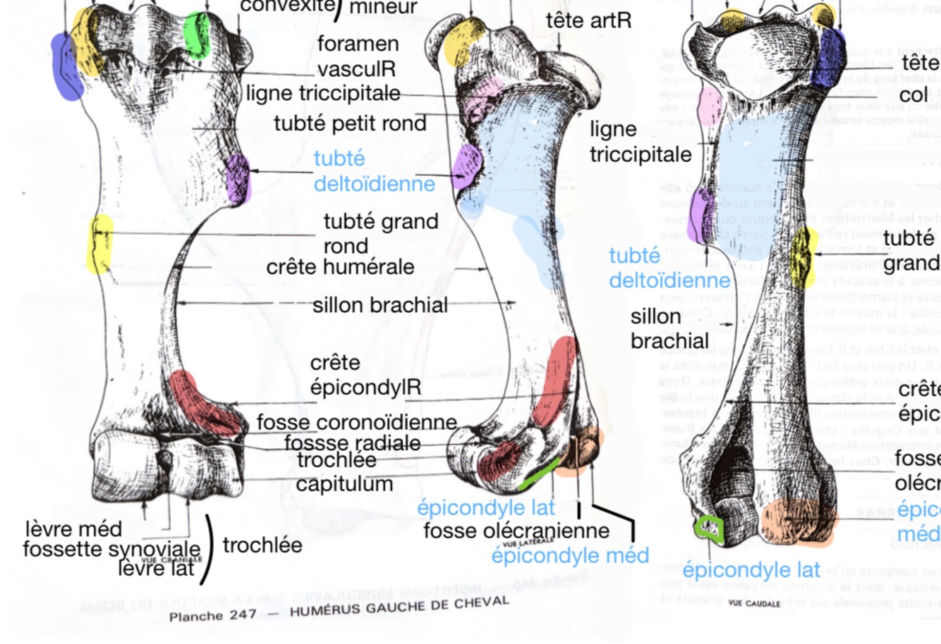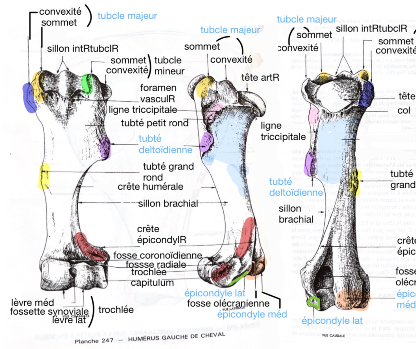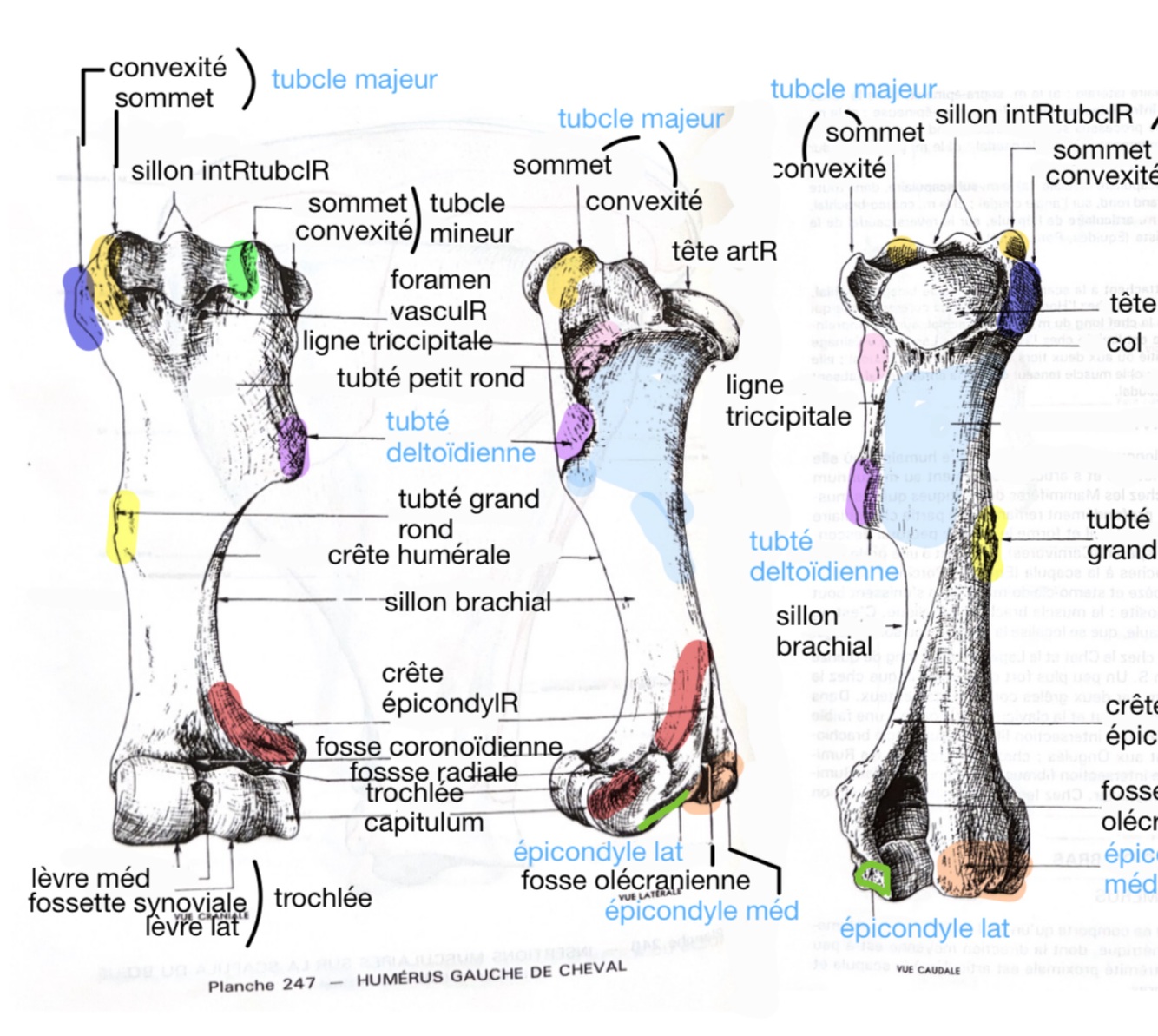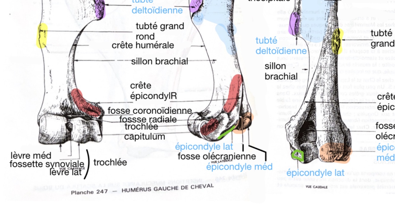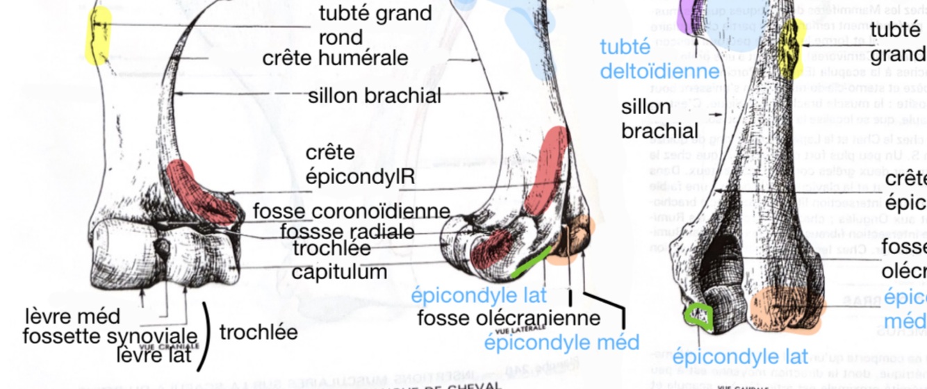 Chez cv, la Crète humérale, tubérosité deltoïdienne et grand rond, Crète epicondylaire sont: