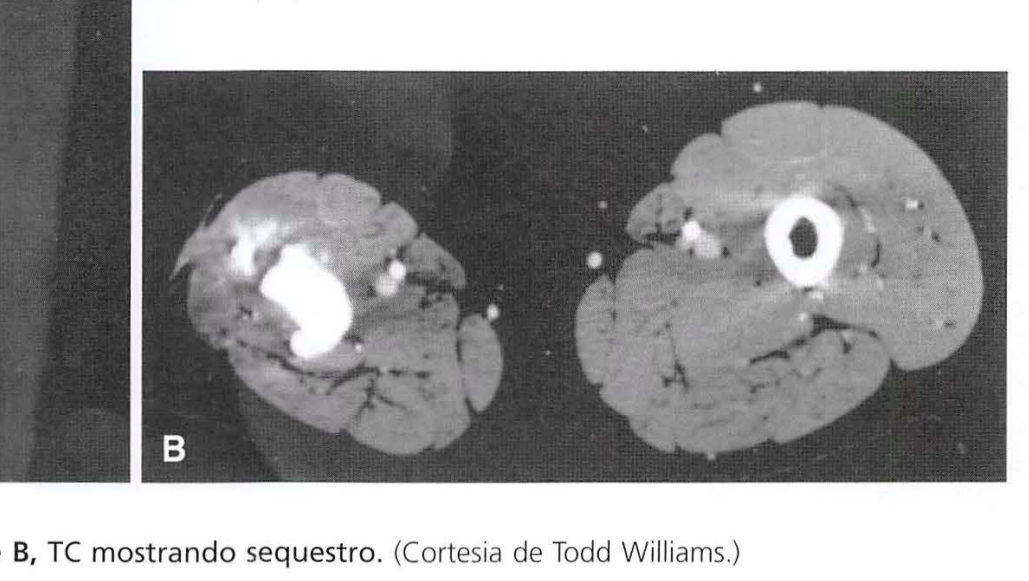 se trata de estrutura rigida, o pus se deslocal pelo sist. de havers e canal de volkmann descolando periosteo e ocupando a medula = necrose do osso cortical (aka sequestro)