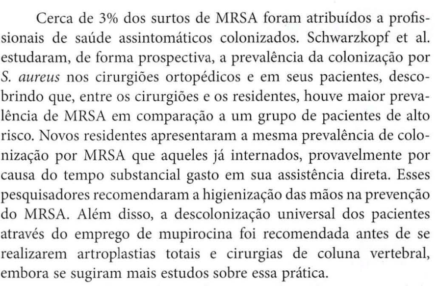 3% dos surtos MRSA - causados por medicos e residentes colonizados e assintomaticos. Lavagem das mãos é a principal forma de prevenção