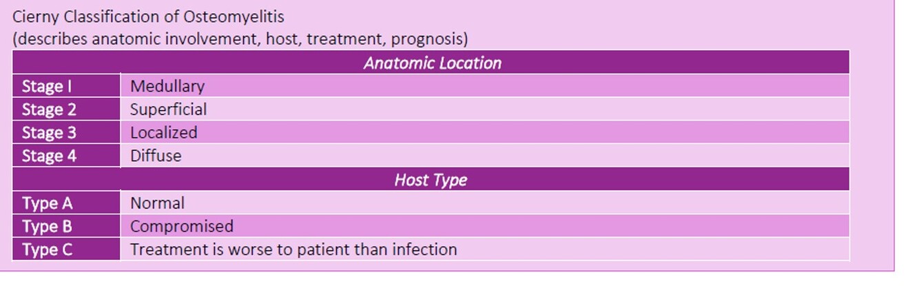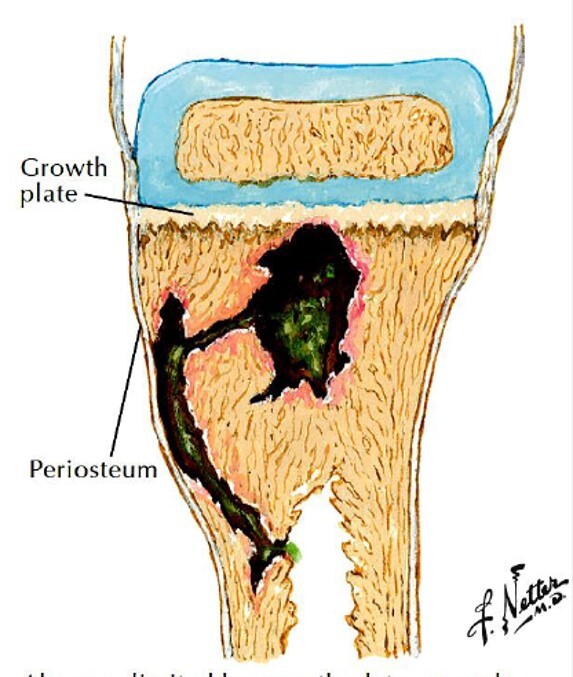 -Abscess, limited by growth plate, spreads transversely along volkmann canals and elevates periosteum; extends subperiosteally and may invade shaft
