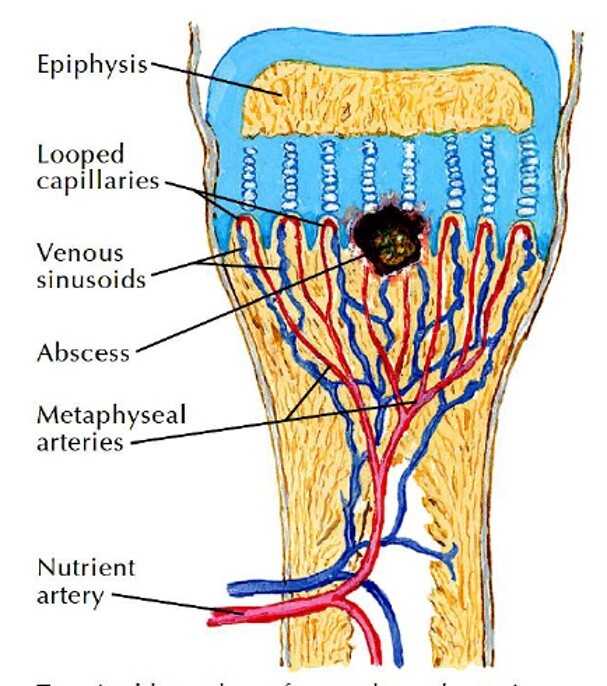 -In infants <1, some metaphyseal arterial branches pass through growth plate, and infection may invade epiphysis and joint