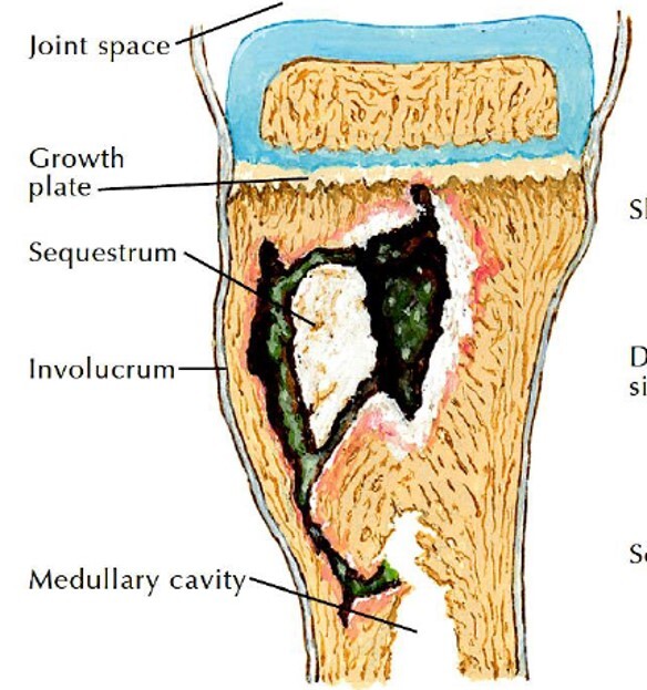 -As abscess spreads, segment of devitalised bone (sequestrum) remains within