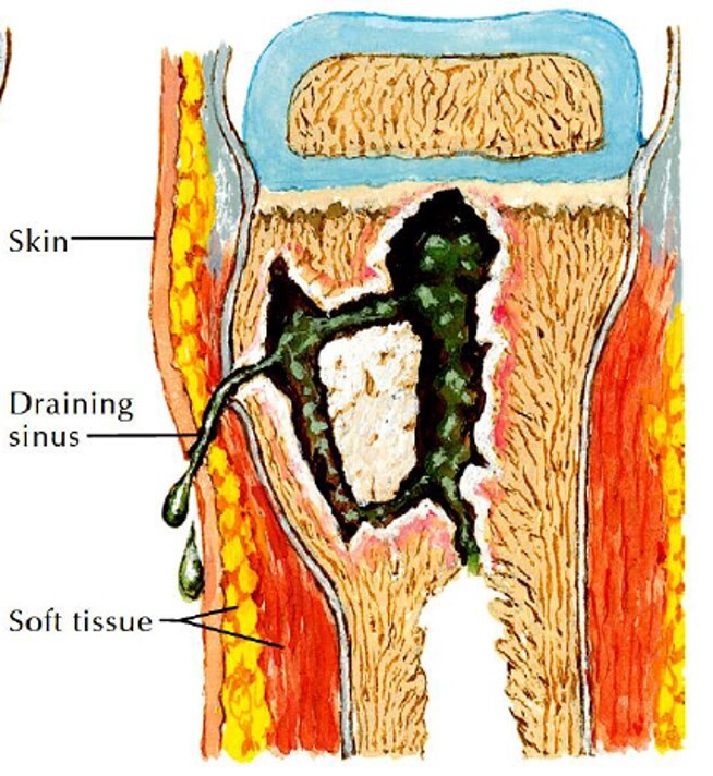 -Infectious process may erode periosteum and form sinus through soft tissues and skin to drain externally