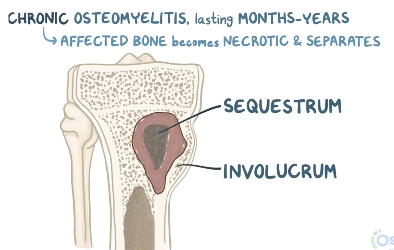 3 - pus moves from medullary to periosteum over 2-3 days