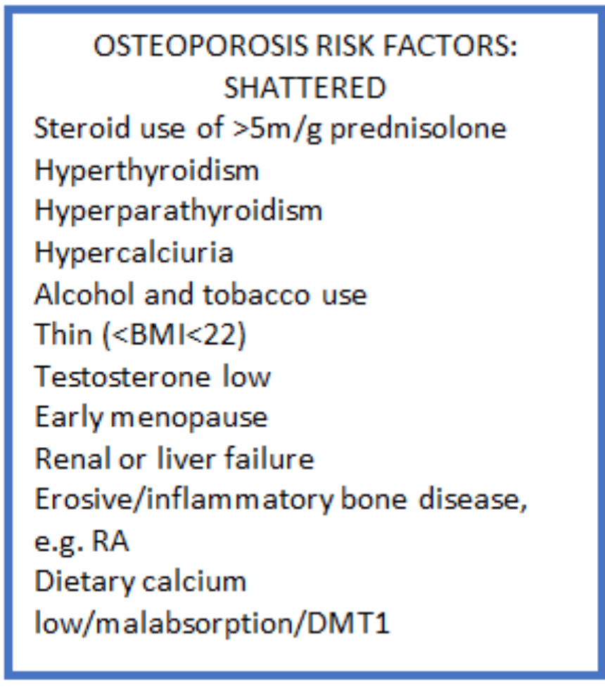 reduced bone density ( more than 2.5 density below peak mass achieved by healthy adults of the age and gender ( T score