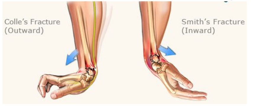 - colle’s fracture ( distal radius after falling on an outstretched hand)