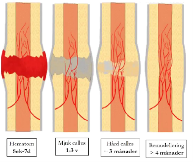 Hematom med tillväxtfaktorer –> mjuk callus med fibroblaster som omvandlas till broskceller som förkalkas och det blir hård callus sen remodellering (läker utan ärr)