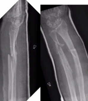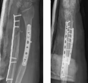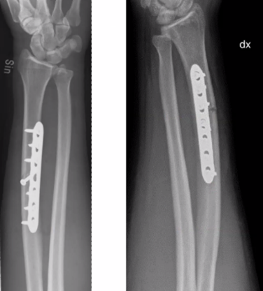 Plattan bra för att styra rotationskrafter, men direkt benläkning i radius och callusläkning i ulna