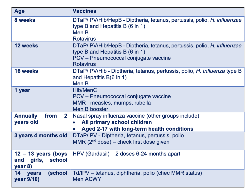 Also, for at risk groups, BCG at birth AND HBV for babies born to Hep B infected mothers, 1 month, 2 months and 12 months