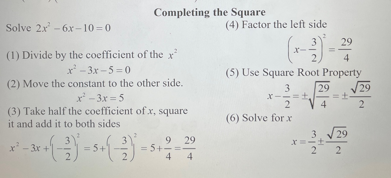 Steps for completing the square