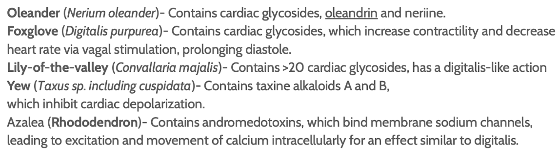 other cardiotoxic plants: oleander (nerium oleander), foxglove(digitalis purpurea), lily of the valley (convallaria majalis) , yew (cuspidata), rhododendron(azalea)