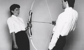 1946- Serbian performance artist - Rhythm 0 (1974-sat passively as audience used objects on her); The Artist is Present (2010-sat silent as audience members sat across from her); Seven Easy Pieces (2005-performed seven pieces from other artists)- Many collaborations with artist Ulay: Rest Energy (1980-an arrow held at her chest-pic); Breathing In Breathing Out (only breathed through each others mouths)