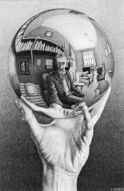 1898-1972 Dutch artist - Known for mathematically inspired woodcuts, lithographs, y mezzotints - Hand with Reflecting Sphere (1935-pic-aka Self-Portrait in Spherical Mirror); Relativity (1953); Waterfall (1961)