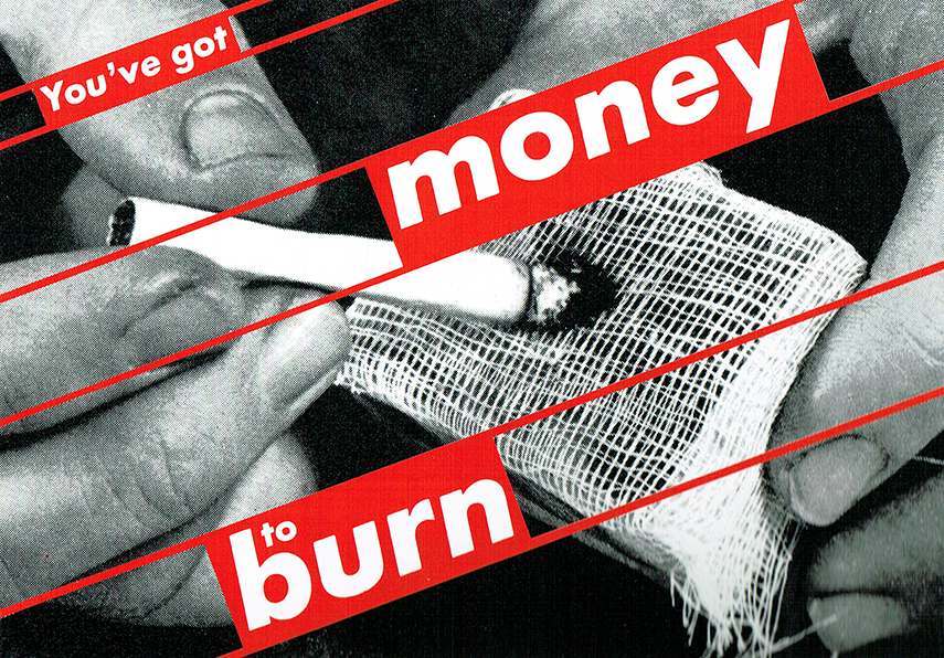 1945- American conceptual artist y collagist from NJ - Works consist of black-and-white photographs overlaid with declarative captions - I Work Therefore I Am (1987); Your Body is a Battleground (1985); You’ve Got Money to Burn (1987-pic)