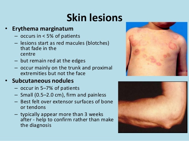 5. SUBCUTANEOUS NODULES: rare. seen over joints (extensor surfaces), scalp & spinal column