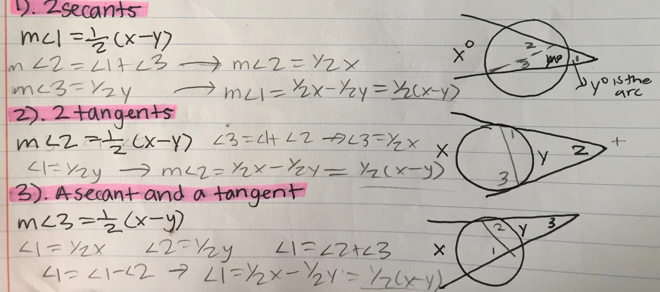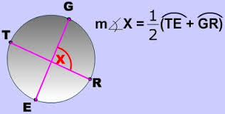 the measure of an angle formed by 2 secants, 2 tangents or a secant and a tangent drawn from a point outside a circle is equal to half the difference of the measures of the intercepted arcs.