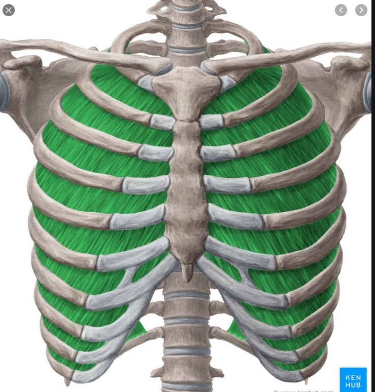 extend inferomedially from the superior rib to the adjacent inferior rib; assist in expanding the thoracic cavity by elevating the ribs during inhalation