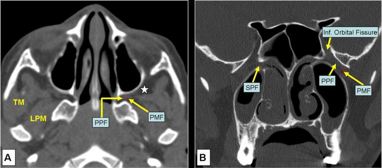 CT/CTA/MRI/MRA of paranasal sinuses, shows a mass with extension into the pterygomaxillary fissure.