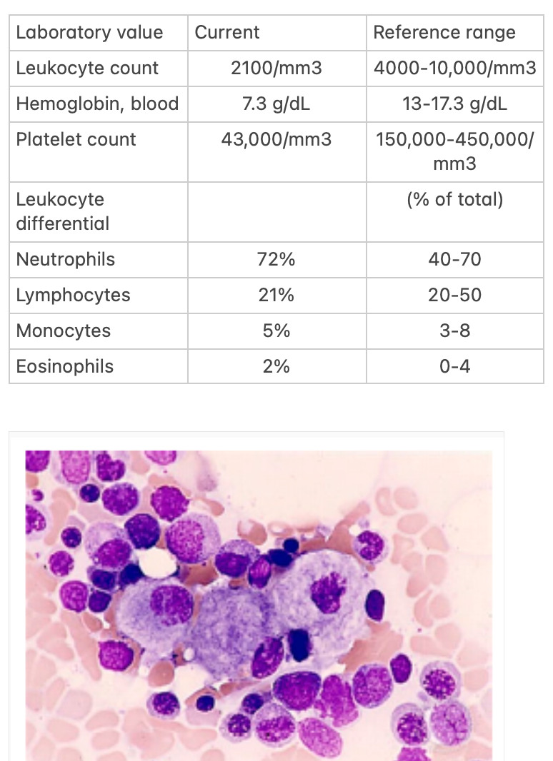 (DASA PROVA 2023) Homem, 67 anos, sem comorbidades prévias, apresentava tosse produtiva há 3 semanas, febre vespertina de 38oC, associado a sudorese noturna e perda de 5% do peso nesse período. No momento evoluindo com piora do estado geral e necessidade de internação em unidade de terapia intensiva. Ao exame físico apresentava baço palpável a 3cm do rebordo costa esquerdo e adenomegalia em cadeias cervicais e axilares bilateralmente.Exames laboratoriais: Hb 6,7 g/dL, VCM 90 fL, leucócitos 1890/mm³, neutrófilos 730/mm³, linfócitos 840/mm³, monócitos 10/mm3e plaquetas 63.000/mm³. DHL 450U/L, INR 1,2, TTPa ratio 1,3, fibrinogênio 120mg/dL. Vitamina B12 514pg/mL, ferritina 5000 ng/mL. Iniciado antibioticoterapia com cefepime. Realizado mielograma (imagem abaixo).Descreva o mielograma e o diagnóstico: