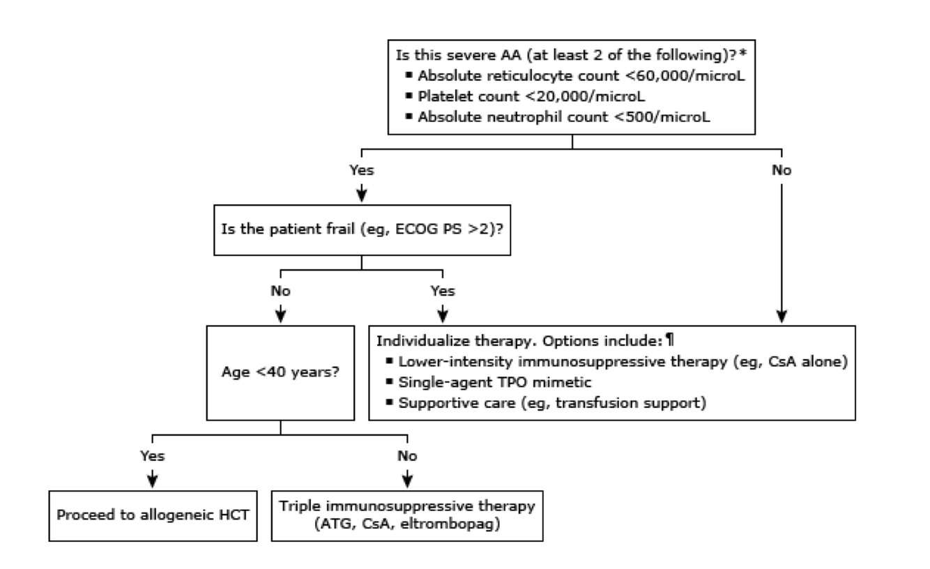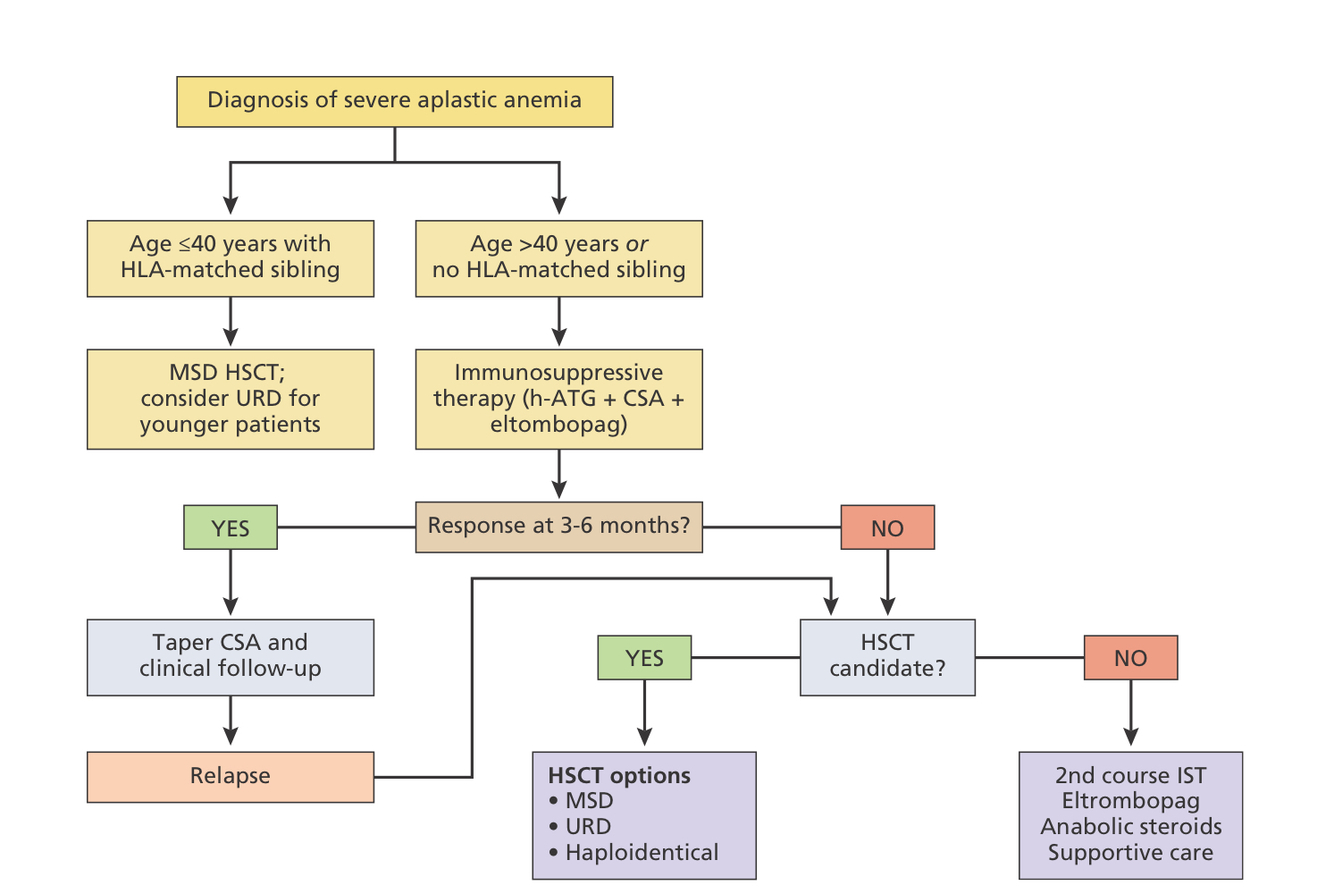Trata-se de um paciente jovem, < 40 anos, com história dfe anemia aplásica grave. Só com essa informação, sabemos que o tratamento ideal, caso o paciente possua algum doador aparentado HLA identico, já indicaria TMO alogenico em primeira linha. Alguns autores já indicam terapia com TMO com doadores alternativos (NAP ou Haplo) tendo em vista o benefício em menor taxa de infecção, menor necessidade de suporte transfusional e menor risco de evolução clonal para SMD ou LMA. No entanto, também estaria correto o tratamento com ISS (idealmente tripla com ATG, CsA e Eltrombopag) seja em primeira linha ou até definição de doadores alternativos.