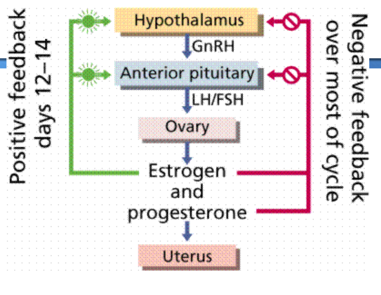 hypothalamus produit GnRH → hypophyse produit LH/FSH → ovaires produisent estrogène et progestérone → estrogène seulement a un feedback + sur hypothalamus et hypophyse