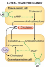 hypothalamus produit GnRH → hypophyse produit LH/FSH → ovaires produisent estrogène et progestérone → estrogène et progestérone ont un feedback - sur hypothalamus et hypophyse