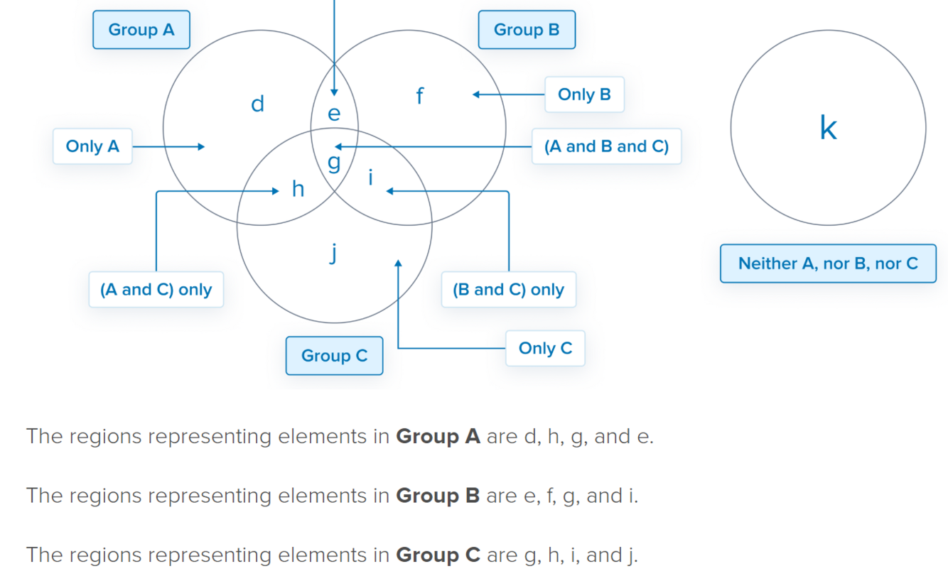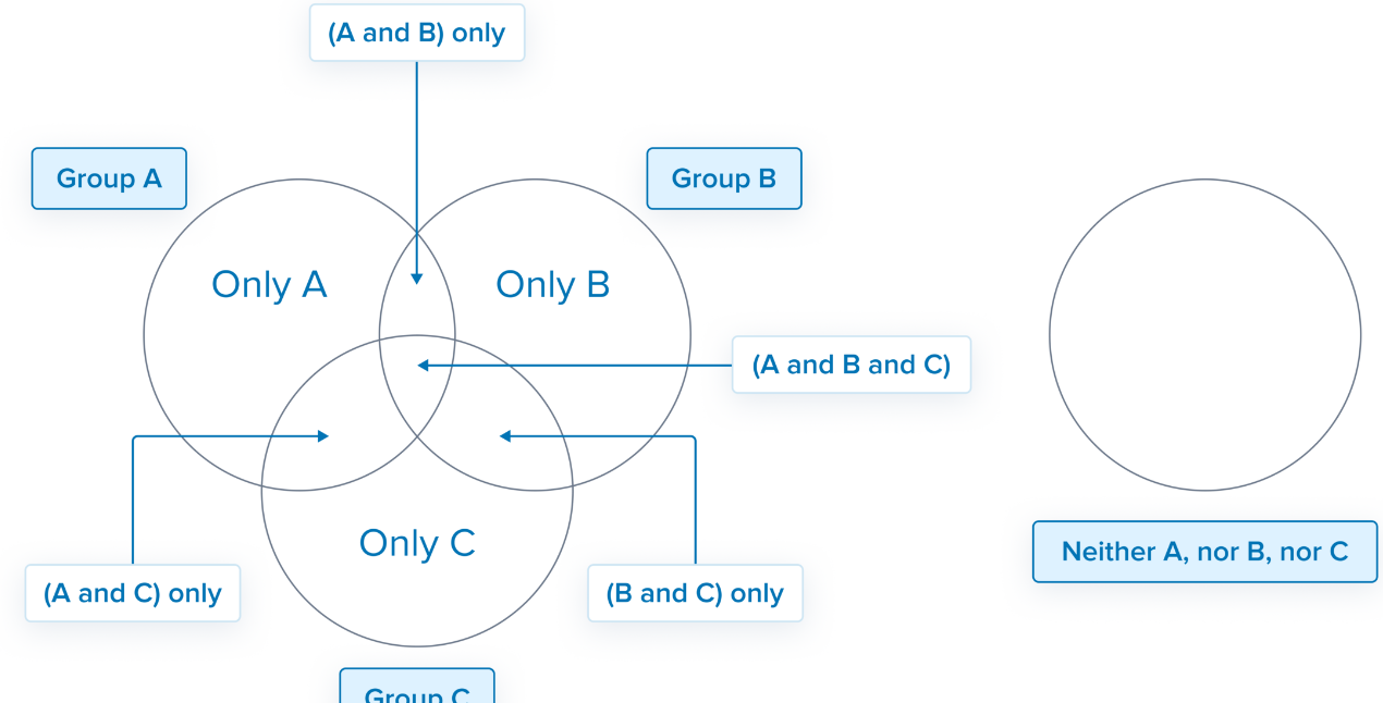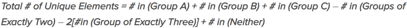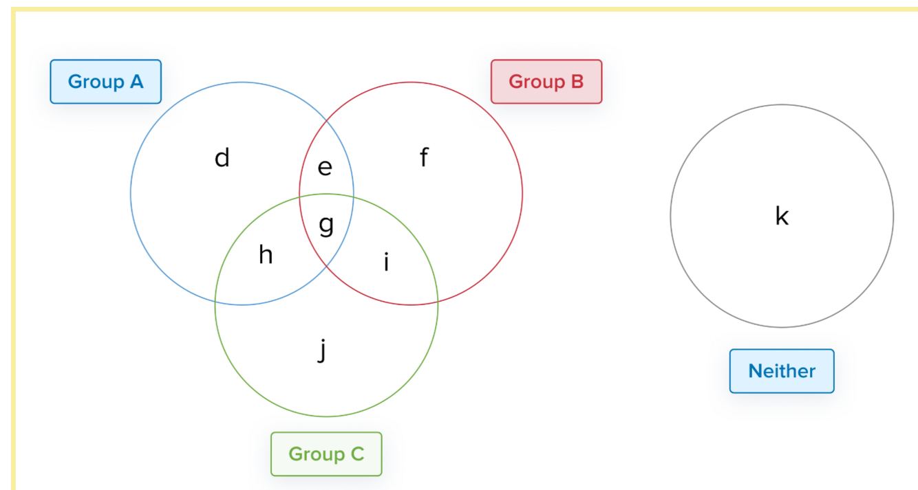 the total number of unique elements in a group is the sum of all the elements belonging to exactly one group, all the elements belonging to exactly two groups, all the elements belong to exactly three groups, and all the elements belonging to none of the groups - represented as the sum of all the variables in the following screenshot