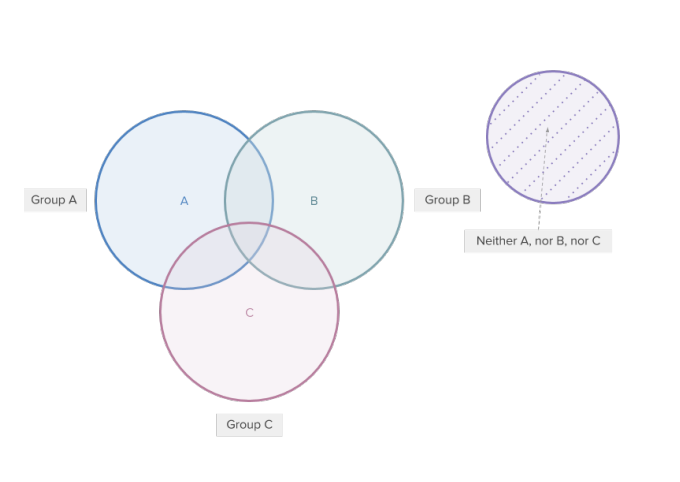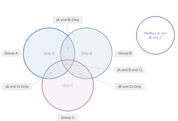 –> Total # of Unique Members = #[A only + B Only + C Only] + #[(A and B) Only + #(A and C) Only + #(B and C) Only] + #[(A and B and C)] + #[Neither A nor B nor C]