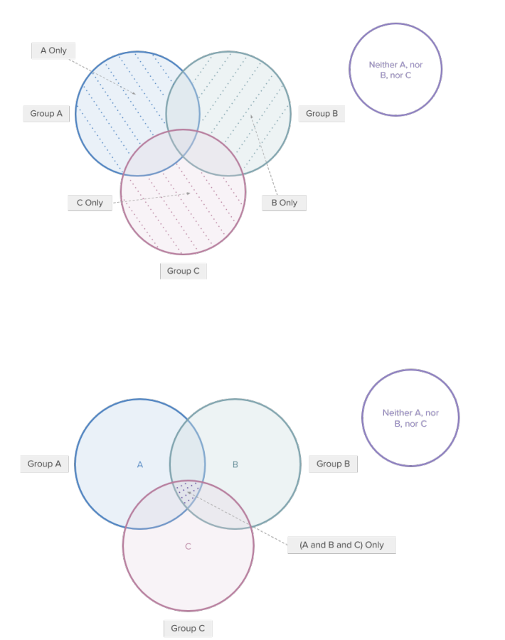 –> Total # of Unique Elements = # in (Group A) + # in (Group B) + # in (Group C) - # in (Groups of Exactly Two) - 2[#in (Group of Exactly Three)] to # in (Neither)
