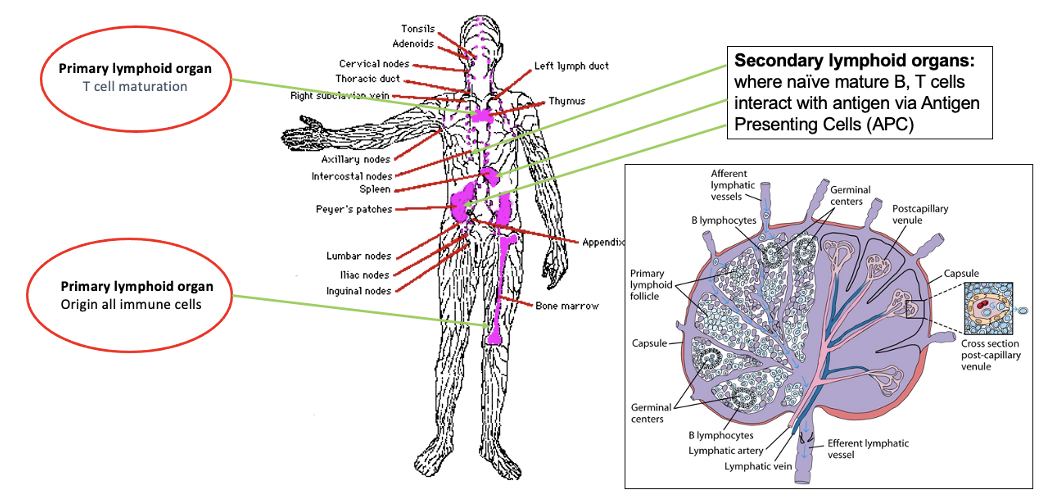 Naïve mature B, T cells interact with antigens via antigen presenting cells (APC)