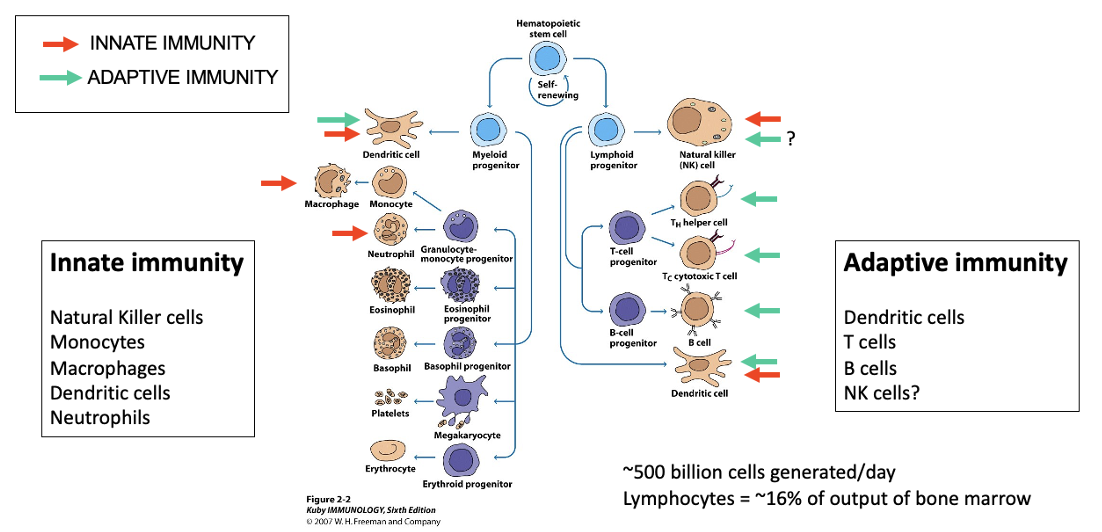 Tell me the branches of the immune system, what the starting cell is and what this forms.
