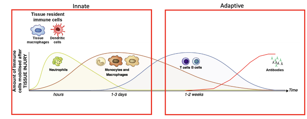 Tell me the timeline for the course of normal immune response action and the types of immune response and cells active in each part?