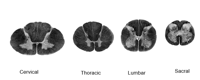 Cervical: Lots of white matter due to sensory and motor information doing to all of the body below it.