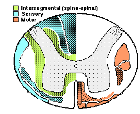 Draw the spinal cord with Sensory, Motor and Intersegmental areas