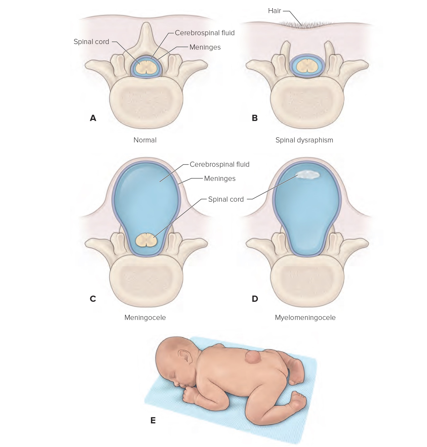 Meningocele (Fluid filled sac of meninges protruding through spinal defect with spinal cord contained in the spinal canal)