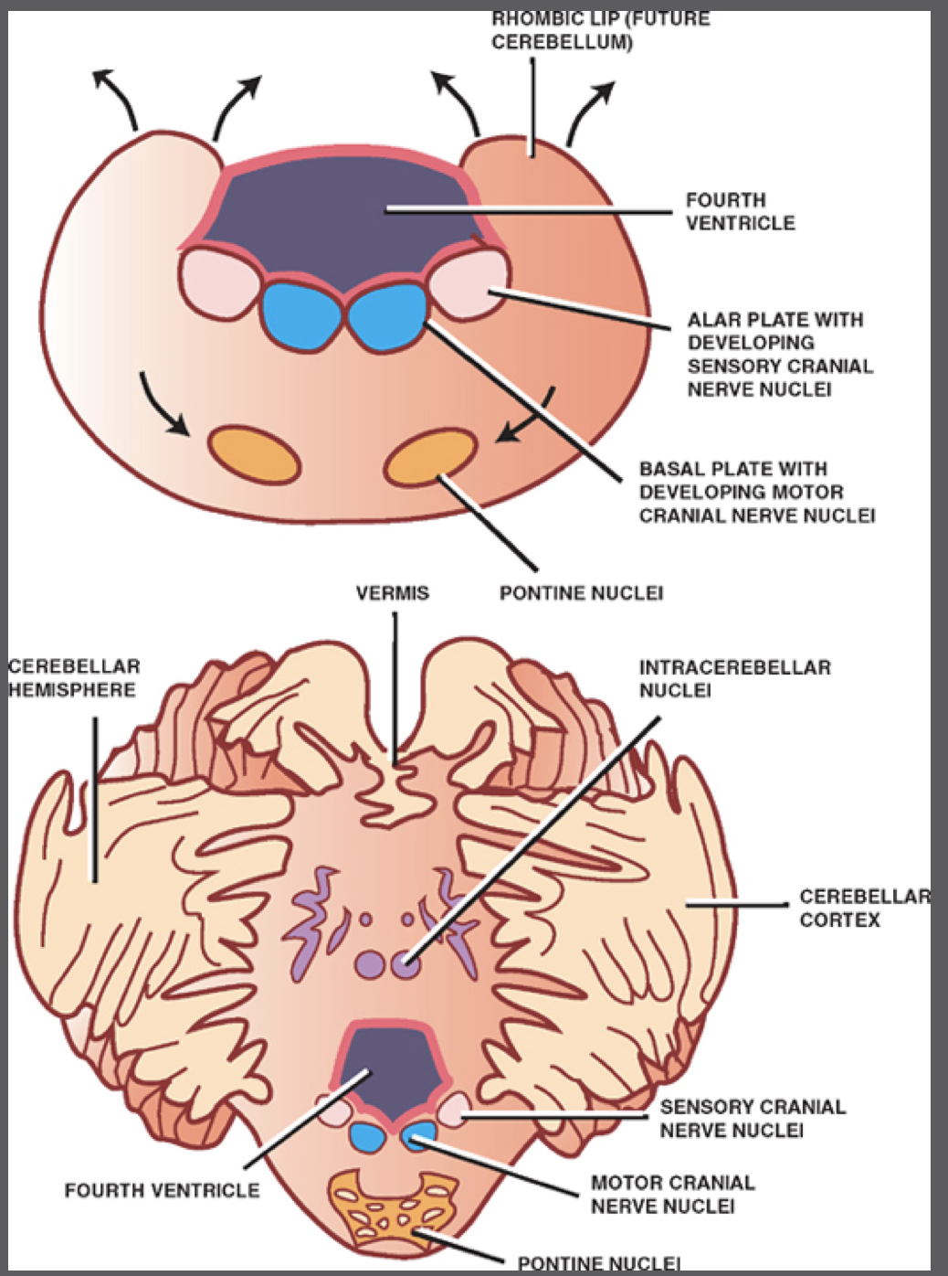 Forms from dorsolateral thickenings of metencephalon which overgrow the root of the fourth ventricle (rhombic lips)