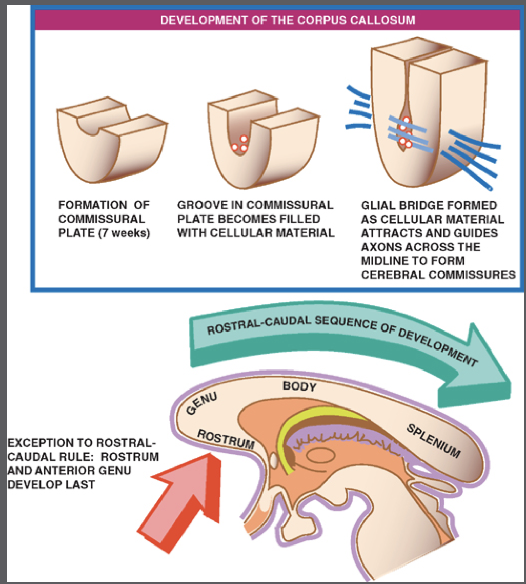 The exception is the rostral most portion of the corpus callosum- rostrum and anterior genu which develop last